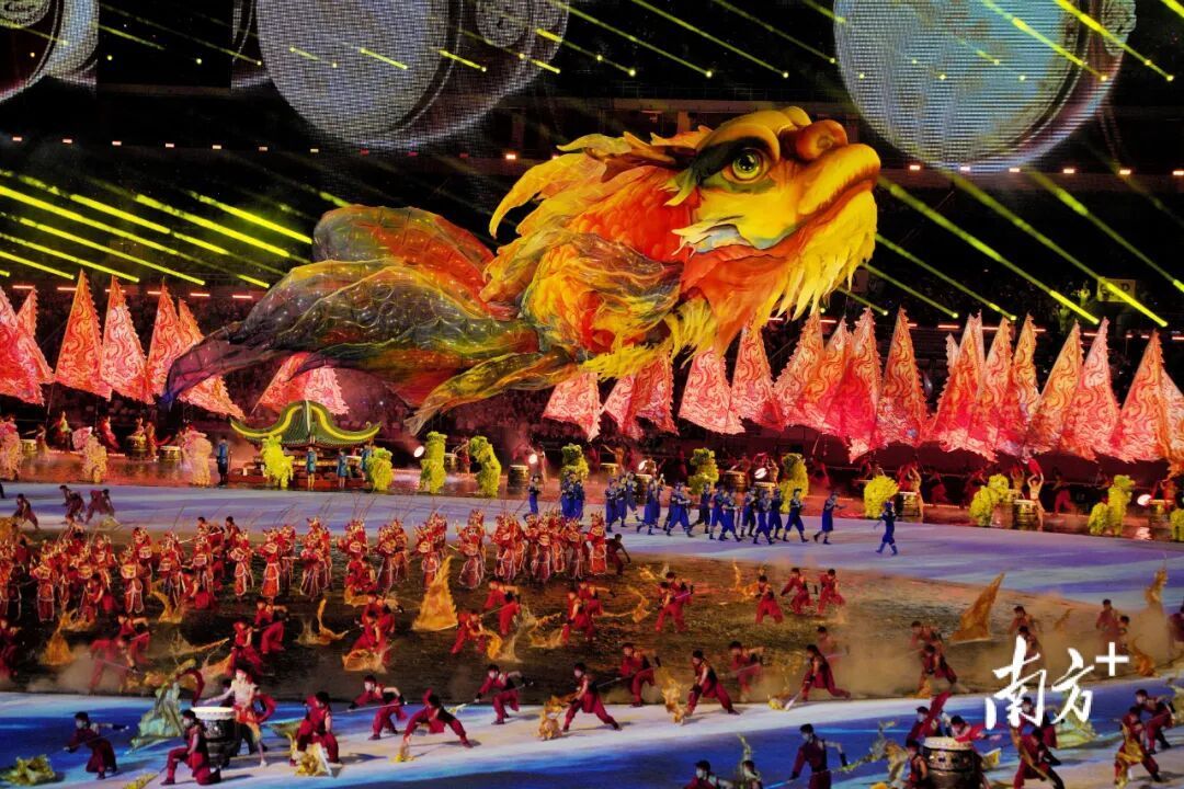 灯光渐熄,全场屏息。一只巨大的金色“鳌鱼”装置,在少年武者的牵引下灵动遨游于场馆半空,如梦似幻、惊艳四座,引起观众阵阵惊呼:“大鱼海棠”在这一刻具象化了!