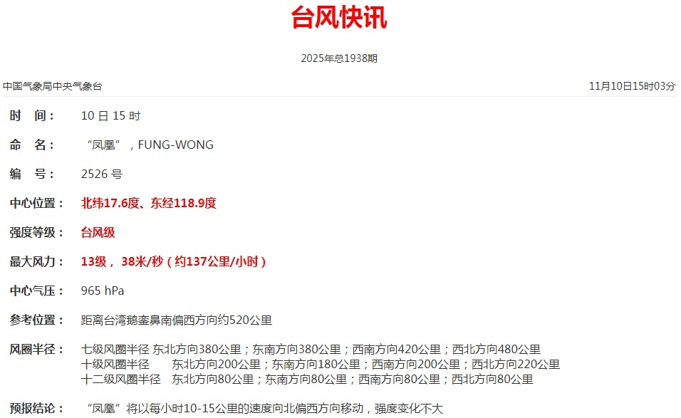 今年第26号台风“凤凰”已于9日晚上在菲律宾吕宋岛东部近海由超强台风级减弱为强台风级,随后于9日20时30分前后在菲律宾吕宋岛奥罗拉省沿海登陆,登陆时中心附近最大风力15级(50米/秒),10日凌晨减弱为台风级,之后穿过吕宋岛移入南海东部海面,15时其中心位于北纬17.6度、东经118.9度,距离台湾鹅銮鼻南偏西方向约520公里,中心附近最大风力有13级(38米/秒)。