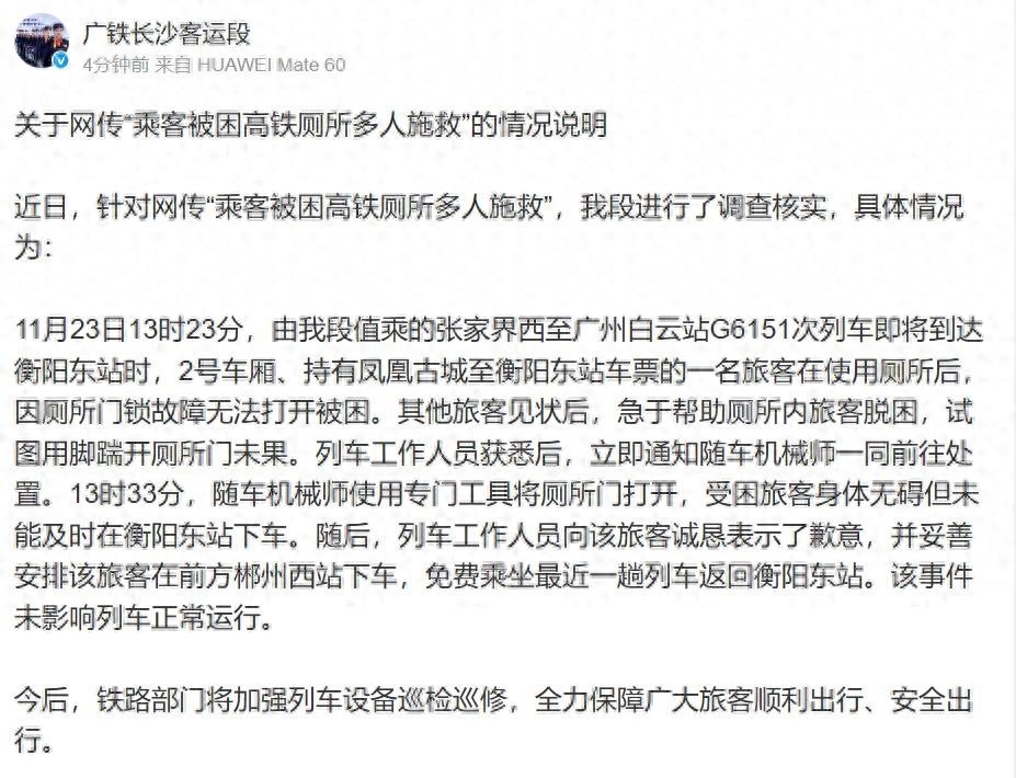 关于网传“乘客被困高铁厕所多人施救”的情况说明近日,针对网传“乘客被困高铁厕所多人施救”,我段进行了调查核实,具体情况为:11月23日13时23分,由我段值乘的张家界西至广州白云站G6151次列车即将到达衡阳东站时,2号车厢、持有凤凰古城至衡阳东站车票的一名旅客在使用厕所后,因厕所门锁故障无法打开被困。其他旅客见状后正规配资十大排名,急于帮助厕所内旅客脱困正规配资十大排名,试图用脚踹开厕所门未果。列车工作人员获悉后,立即通知随车机械师一同前往处置。13时33分,随车机械师使用专门工具将厕所门打开,受困旅客身体无碍但未能及时在衡阳东站下车。随后,列车工作人员向该旅客诚恳表示了歉意,并妥善安排该旅客在前方郴州西站下车,免费乘坐最近一趟列车返回衡阳东站。该事件未影响列车正常运行。今后,铁路部门将加强列车设备巡检巡修,全力保障广大旅客顺利出行、安全出行。此前报道:11月23日,一段男子在高铁上猛踹厕所门的视频,引发关注。视频显示,两名男子用力连续猛踹厕所门,现场有多位乘客围观,乘务员也在现场。网友猜测,是不是有人在厕所里面抽烟。