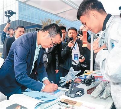 “大刘老师,我从小学三年级就开始读您的作品,‘入坑’作是《全频带阻塞干扰》。这是我拼装的《三体》恒星级战舰‘自然选择’号模型,这张手绘海报汇集了您多部作品里的金句,这是我们社团成员合作完成的科幻小说《桃花源记》《永恒不再》……”当刘慈欣来到陆逸航所在社团的摊位前,他激动无比。