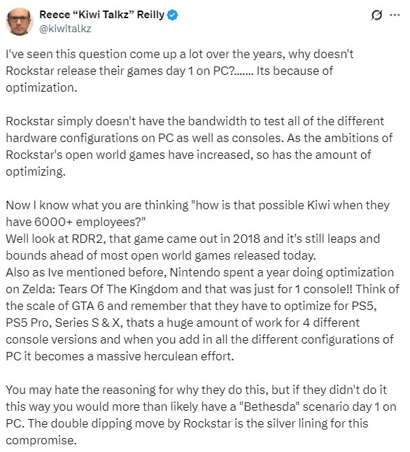 Kiwi Talkz表示:“R星根本没有足够精力,既做好主机平台的优化,还同时测试PC平台所有不同的硬件配置。随着R星开放世界游戏的规模不断扩大,优化工作量也随之增加。”