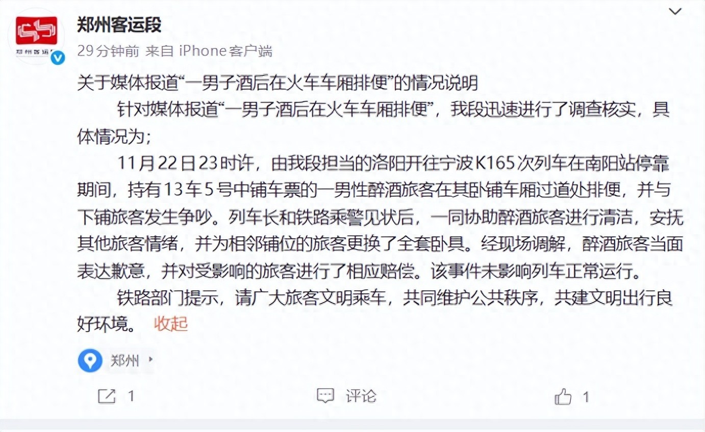 11月24日,@郑州客运段 发布《关于媒体报道“一男子酒后在火车车厢排便”的情况说明》:针对媒体报道“一男子酒后在火车车厢排便”,我段迅速进行了调查核实,具体情况为:11月22日23时许,由我段担当的洛阳开往宁波K165次列车在南阳站停靠期间,持有13车5号中铺车票的一男性醉酒旅客在其卧铺车厢过道处排便实盘配资网站,并与下铺旅客发生争吵。列车长和铁路乘警见状后,一同协助醉酒旅客进行清洁,安抚其他旅客情绪,并为相邻铺位的旅客更换了全套卧具。经现场调解,醉酒旅客当面表达歉意,并对受影响的旅客进行了相应赔偿。该事件未影响列车正常运行。铁路部门提示,请广大旅客文明乘车,共同维护公共秩序,共建文明出行良好环境。